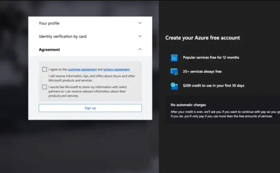 Ако създавате акаунта, ще бъдете помолени да потвърдите акаунта си с кода. След като предоставите кода и настроите акаунта, той ще ви отведе до страницата на профила, където въвеждате информация за вашия профил и данни за картата за проверка и споразумение, както е показано по-долу.